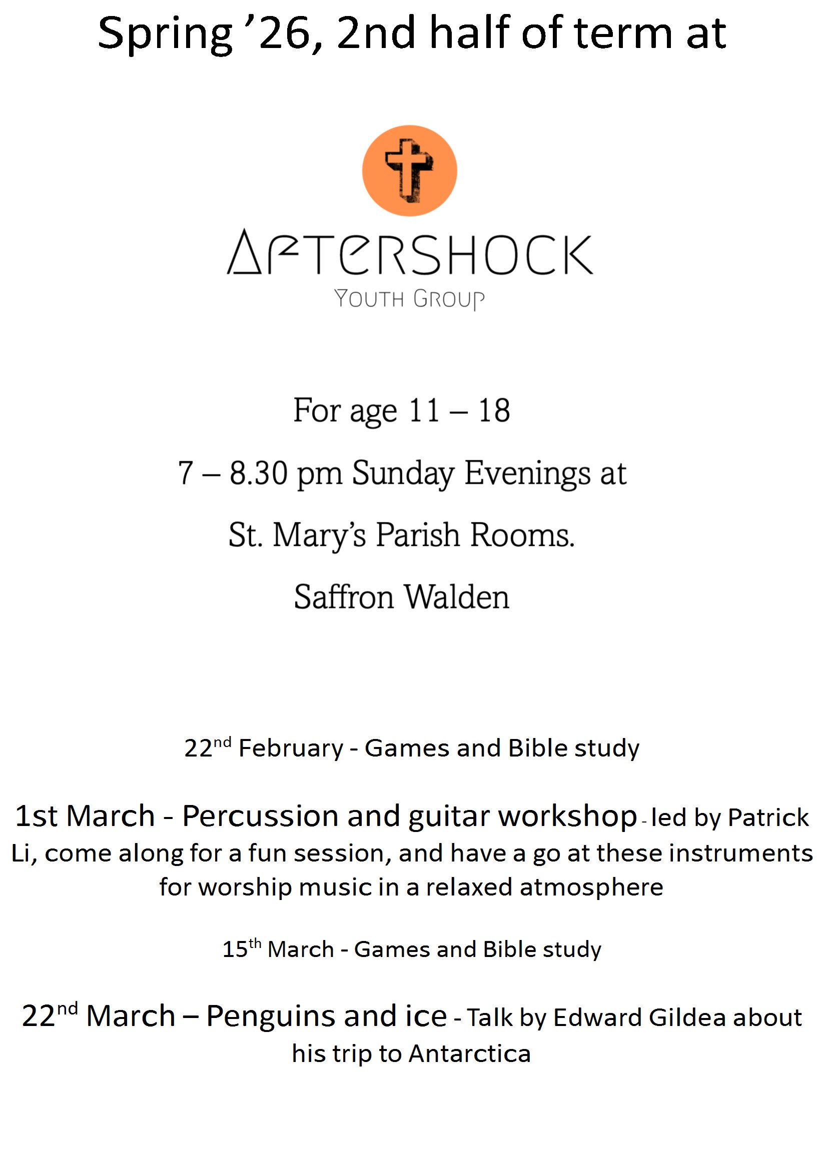 If you would like to join or find out more about Aftershock then please do contact Julie Lester, our Children and Youth Leader - childrenandyouth@stmaryssaffronwalden.org 07356 278 643 (for messages only)